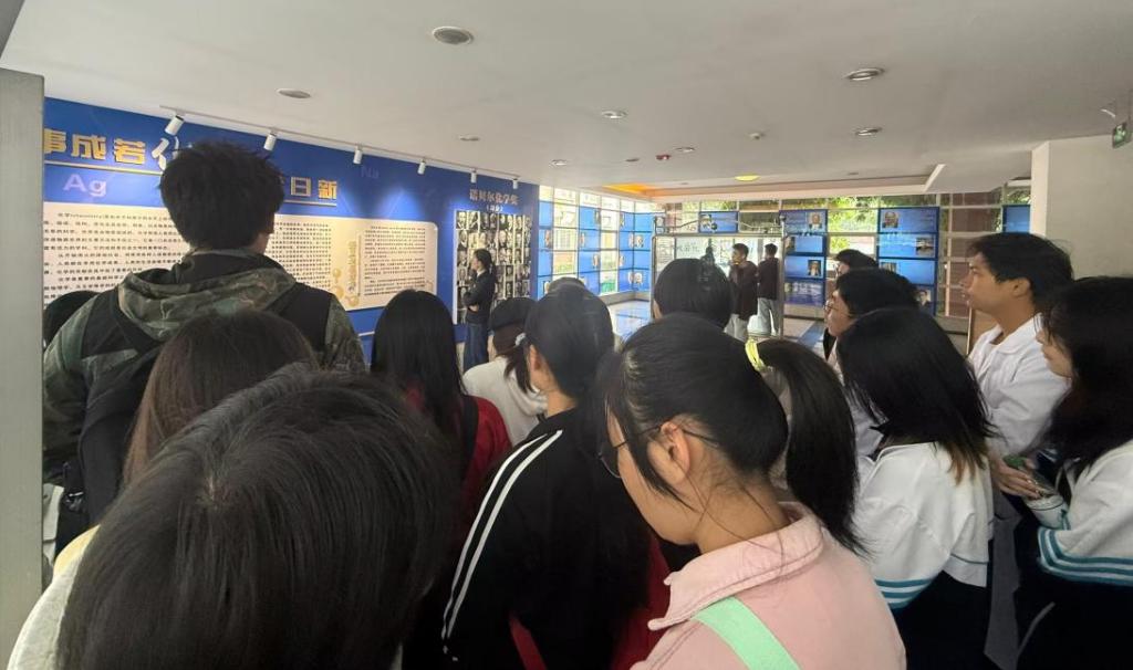 教学楼内的文化墙前,新生们驻足聆听讲解。文化墙以“事成若化 工求日新”为主题,系统呈现了化学学科的基本概念和发展脉络,展示了历届诺贝尔化学奖得主的科研事迹,让新生们直观感受化学学科的深厚底蕴与科研魅力。