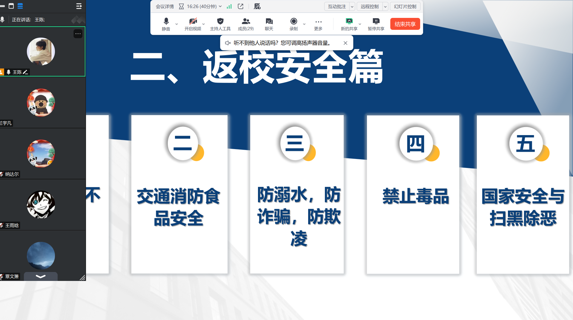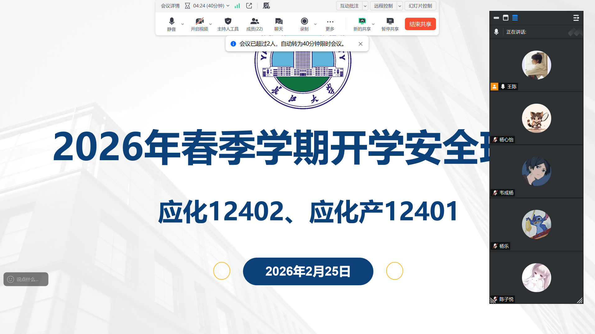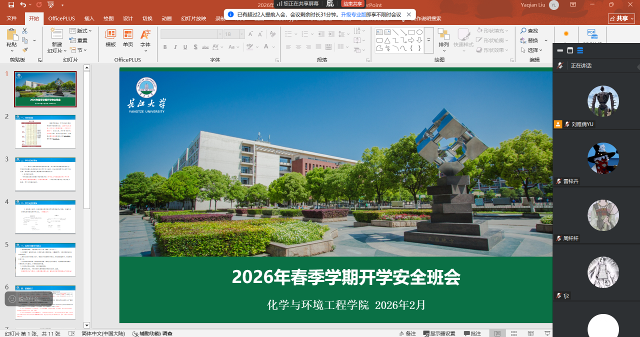 组织本科生、研究生各班级,通过线上会议形式陆续召开2026年春季学期开学主题班会。