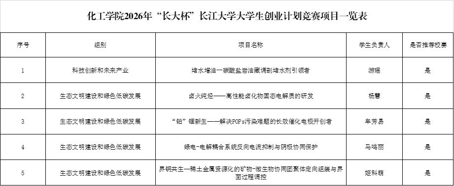 按照《关于举办2026年“长大杯”长江大学大学生创业计划竞赛暨“挑战杯”中国大学生创业计划竞赛校内选拔赛的通知》的要求,经过学生提交申请、学院评审,拟推荐《堵水增油--碳酸盐岩油藏调剖堵水剂引领者》等5个项目申报校级挑战杯,具体名单如下。