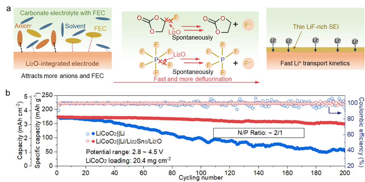 10月8日,禁漫天堂 肖围教授课题组在高性能锂金属电池领域取得重要研究进展,其成果"Li2O-Integrated Electrodes Enabling Enhanced Adsorption/Defluorination Kinetics toward LiF-Rich Interphase for High-Performance Lithium Metal Batteries"发表于国际顶级学术期刊Advanced Functional Materials。该研究创新性地通过电极设计,集成对碳酸酯电解液中含氟组分吸附/去氟化能力强的纳米氧化物,在金属锂电极表面原位构筑了化学/电化学稳定的含氟保护层,改善了锂金属负极的电化学性能。李国成博士为论文第一作者,肖围教授为论文第一通讯作者,长江大学为论文通讯第一单位。 内容简述: 锂金属负极因其极低的氧化还原电位和极高的理论比容量,被视为下一代高能量密度电池的理想选择。然而,其实际应用受限于较差的循环稳定性,主要归因于与碳酸酯电解液的高反应性。这种反应导致形成不稳定的固体电解质界面(SEI),在循环过程中易破裂,持续消耗活性锂和电解液。同时,天然SEI在组成、形貌和离子导率上的不均匀性会引发锂离子通量分布不均和成核位点杂乱,进而导致枝晶生长和电池短路。构建稳定均一的SEI层成为抑制副反应和枝晶问题的关键。研究发现,富含LiF等无机成分的SEI可有效提升界面稳定性。现有策略(如高浓度电解液、添加剂和表面修饰)主要通过调控电解液组成或界面化学来促进含氟物种分解生成LiF,但往往依赖复杂配方或精密工艺。相比之下,从电极设计入手,开发能高效吸附并促进含氟组分去氟化的新方法,为构建稳定富LiF界面提供了更具潜力的替代路径。 本研究提出了一种通过调控复合电极对含氟电解质组分的吸附与去氟化动力学,以定向构筑富LiF界面的新策略。采用机械化学方法,在Li/Li22Sn5复合电极中实现了Li2O纳米颗粒的原位、均匀嵌入。研究表明,Li2O对PF6⁻和氟代碳酸亚乙酯(FEC)具有强吸附能力,可加速其自发去氟化过程,进而引导形成以阴离子/FEC衍生物为主的富LiF 固体电解质界面。结合光谱学表征与理论计算,证实了Li22Sn5表面对含氟物种具有优先吸附与去氟化促进作用具有优先吸附与去氟化促进作用,揭示了该界面结构的形成机制。同时,稳定的Li22Sn5合金骨架有助于引导均匀锂沉积并缓冲体积变化,与Li2O协同增强电极稳定性。该复合负极在碳酸酯电解液中实现50次循环内平均库仑效率99.0%。与LiCoO2正极组装的完整电池在苛刻条件(N/P = 2:1,贫电解液20 μL)下表现出优异的循环稳定性,面容量为3.3 mAh cm⁻2,200周后容量保持率达87.0%;180 mAh软包电池在100次循环后仍保持78.2%的容量,充分证明了该电极设计策略的实际应用潜力。 该研究工作得到了国家自然科学基金(52272207和52274292)、北京自然科学基金(2192029)、湖北省杰出青年基金(2020CFA090)等项目的支持。 图文摘要: 图(a)Li/Li22Sn5/Li2O电极吸附/去氟化构筑富含LiF固态电解质界面层示意图;(b)LiCoO2||Li/Li22Sn5/Li2O、LiCoO2||Li电池循环性能对比图。 文章链接://advanced.onlinelibrary.wiley.com/doi/epdf/10.1002/adfm.202523194 (审核:肖围 编辑:常艳玲)