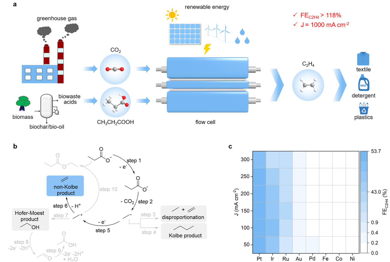 图 a 可再生能源驱动的双极乙烯电合成系统示意图;b 碱性溶液中丙酸脱羧可能的反应路径;c不同催化剂对丙酸脱羧制乙烯的性能比较